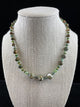 Green Kyanite, Seed Beads, Pearls, Swarovski Crystal, Egyptian Leaded Crystal, Quartz Focal Stone, Lamp Glass, Sterling Stardust Beads, Sterling Clasp. Matching Earrings Included (1 ½” length)