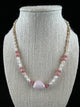Raw Morganite Focal, Morganite rounds/faceted/raw/flutes, Swarovski Crystal, Golden Heishi Pearl, Golden Seeds, Shell Roses, Sterling Stardust Beads, Sterling Clasp.